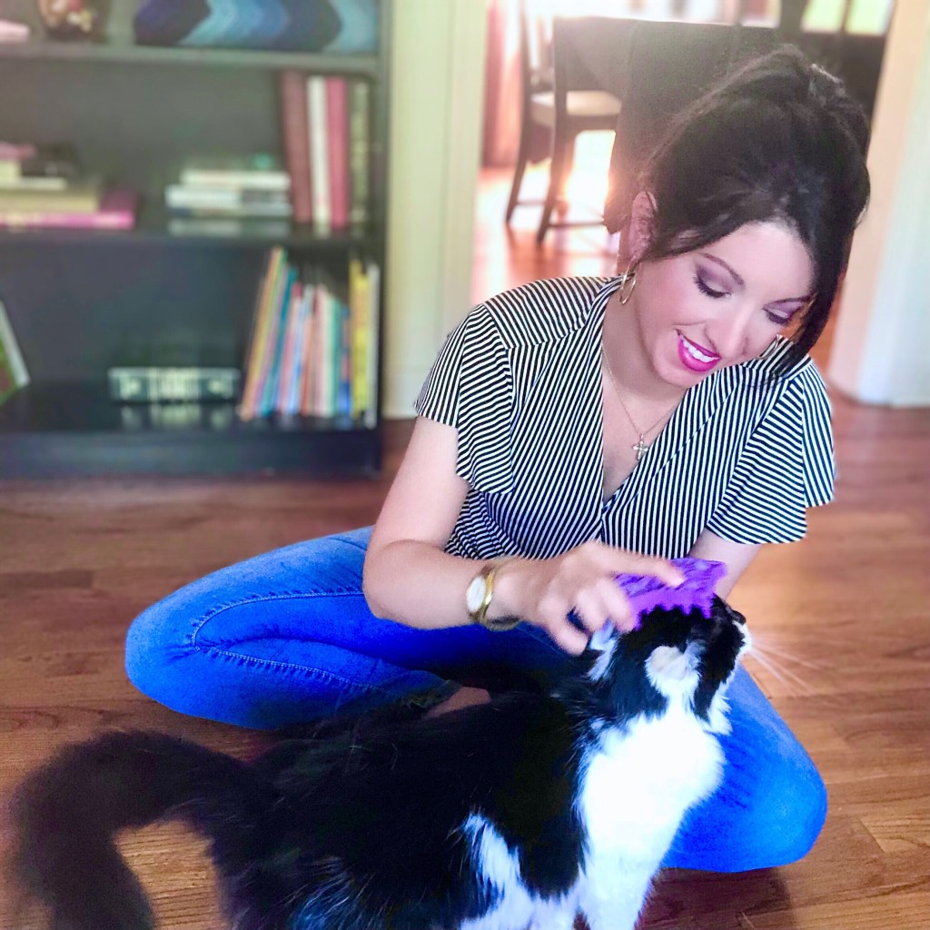It was spring—not too long after moving into the first place I could call my own. I went to sit outside on the porch steps and noticed a black and white cat with a trail of itty bitty black and white fur babies tagging along behind her in a single file line. As they passed by, I heard a “Mew!” coming from behind the bushes. “Mama! I think you forgot someone!” I said playfully, but she wasn’t listening. I got up to take a peak, and there she was—the tiniest of the tiny fur babies—all alone. She didn’t look scared; she looked curious, curious about the world around her. As she was bouncing around and doing her own thing, I wanted so badly to pick her up and take her with me, but I didn’t want to scare her. So I walked back over to the steps to sit. Within a minute or so, there she came, bouncing right up to me. “Mew! Mew!” And that was it; it was all over after that. I picked her up and never put her down again.