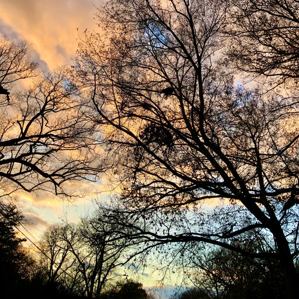 “What will I write about today?” I asked God the other morning. He didn’t answer right away. Because I was listening, at the end of the day, I heard Him loud and clear. I looked up and noticed the bare naked trees in stark contrast against a golden-painted sky. It was, well, beautiful. The dormancy of the trees didn’t take away from the picturesque-ness of it all but only added to it’s beauty. The golden sky seemed to cast a warmth upon the trees as if to say “This too shall pass.”