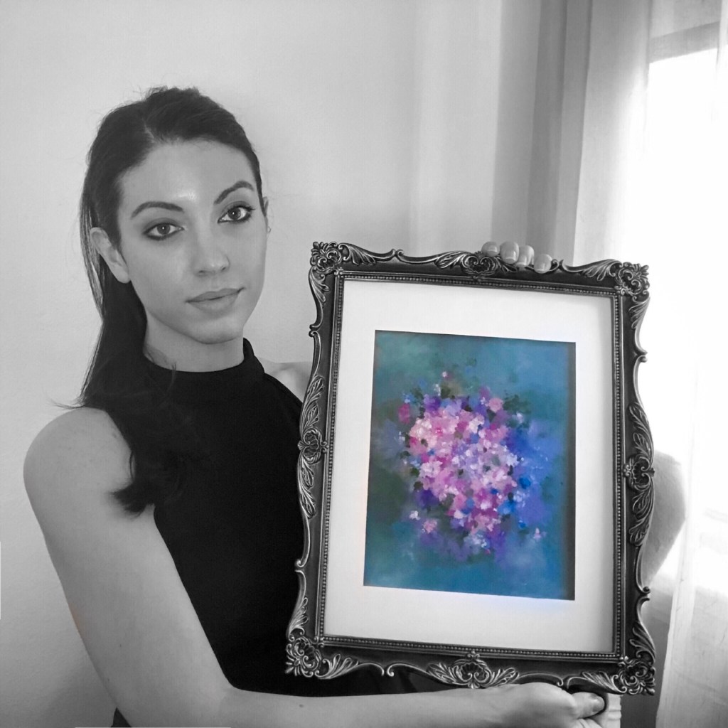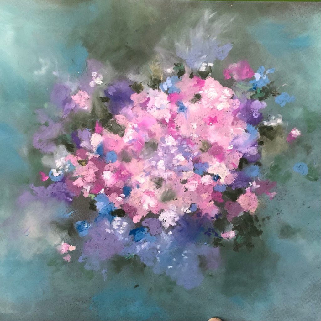 One of my favorite ways to express myself is through this particular art form of abstract florals. I’ve found a few different ways to illustrate the delicate beauty of God’s floral creations, one of which is by finger painting in acrylics. This oil pastel painting was created in much the same way, using my fingers to softly blend pinks, purples, and blues into a backdrop of deep greens and teals.