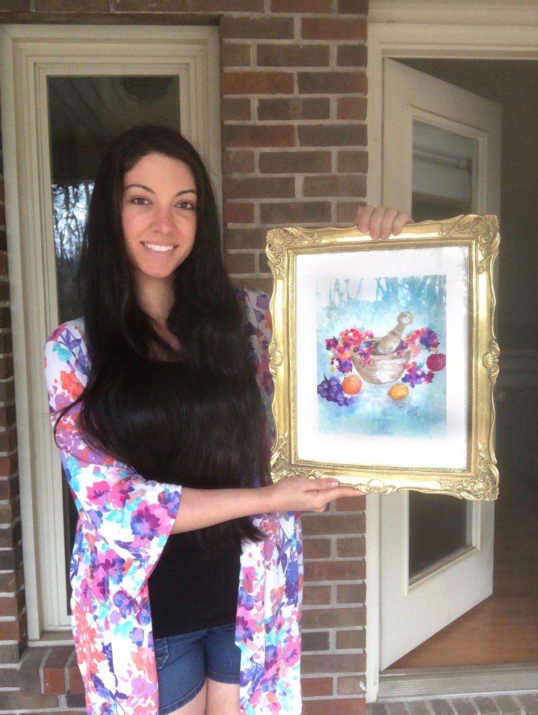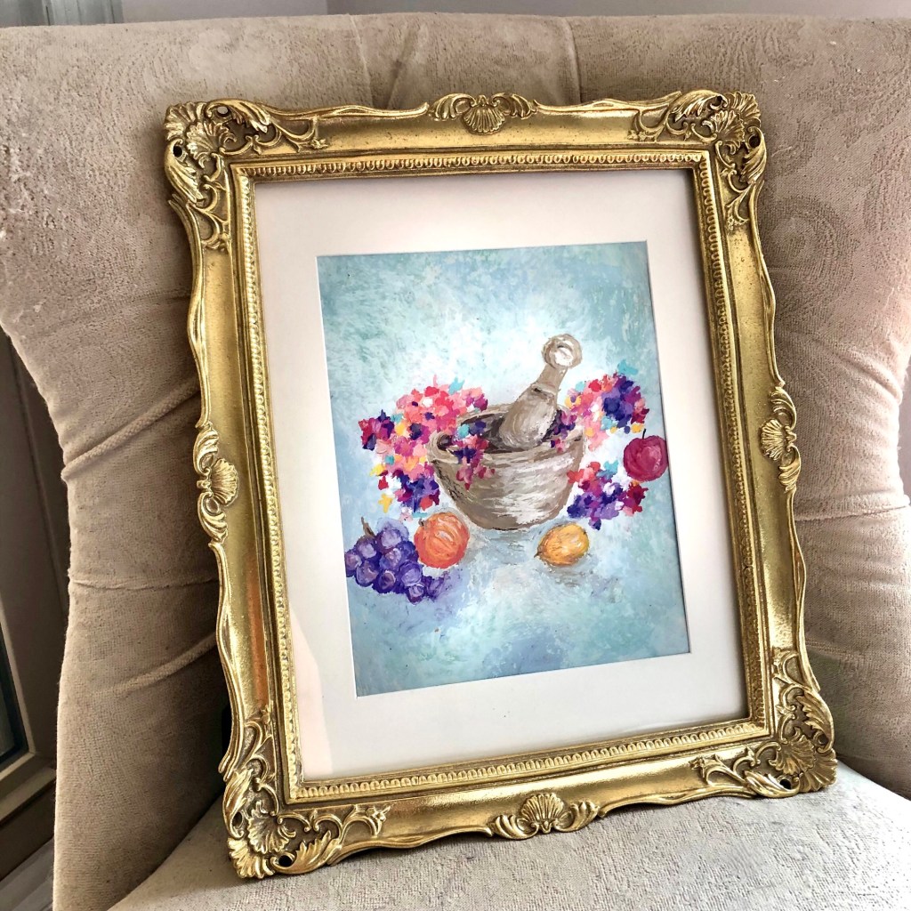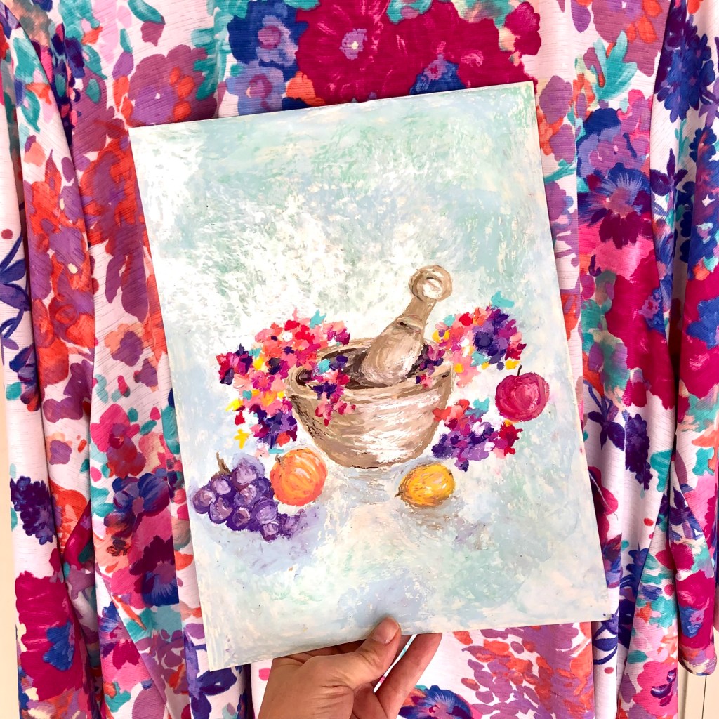 “The New Thing” is inspired by the beauty of surrendering to God’s guidance. The fruits symbolize the parts of our lives we want to hold on to, and the color medley represents the new thing that God has in store. The colors cascading out of the mortar appear as florals, illustrating the beauty that God makes of whatever He replaces. This piece will be hung in our kitchen serving as a reminder to let God make room in our lives for what He has in store.