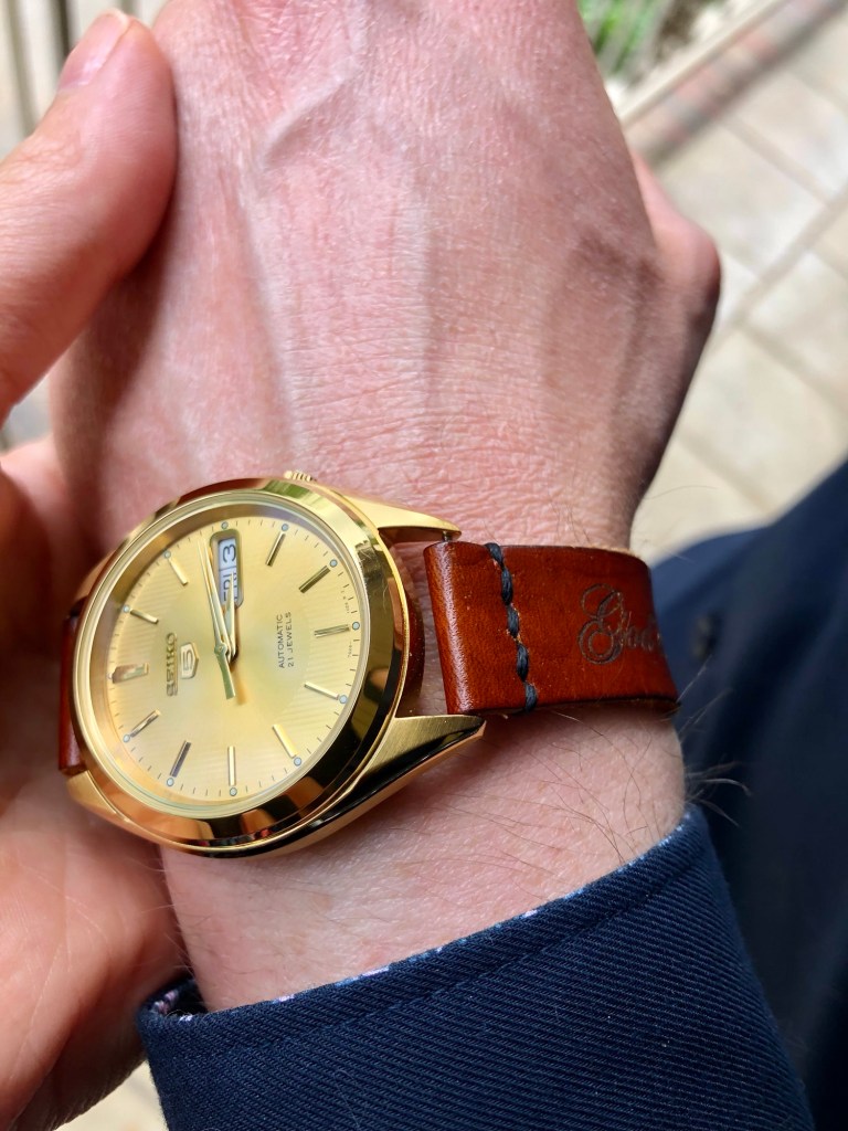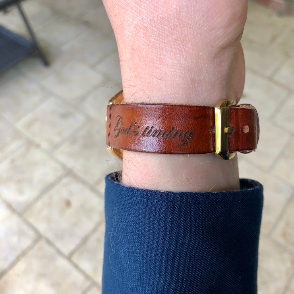 I couldn’t wait to surprise Daniel with his gold Seiko watch. The watch band can be interchanged with a brown leather strap I had personalized for him with the words “God’s timing” engraved in an old world style script. On the inside of the band is the word “entangled” engraved to match the inside of my wedding band. I received two gold rose-shaped earrings with a small diamond on the inside of each rose.